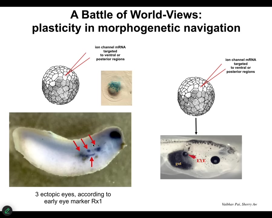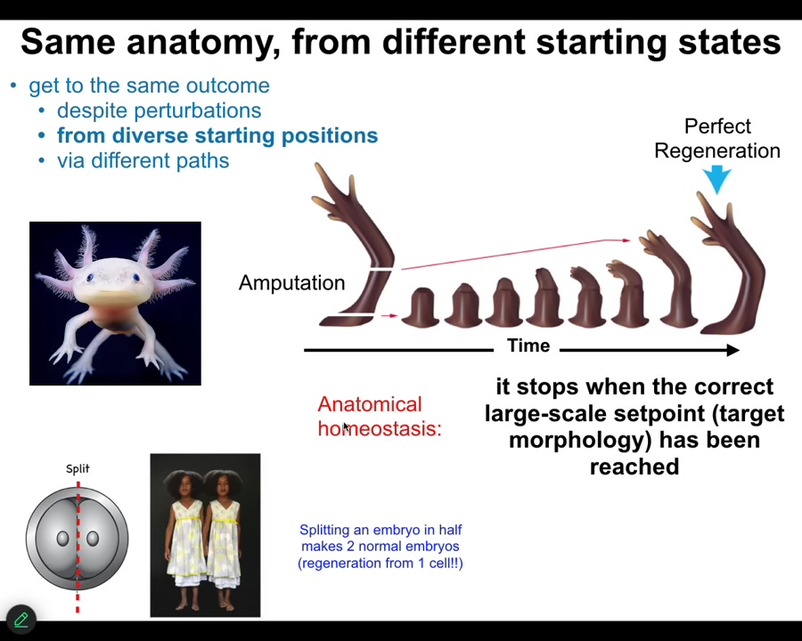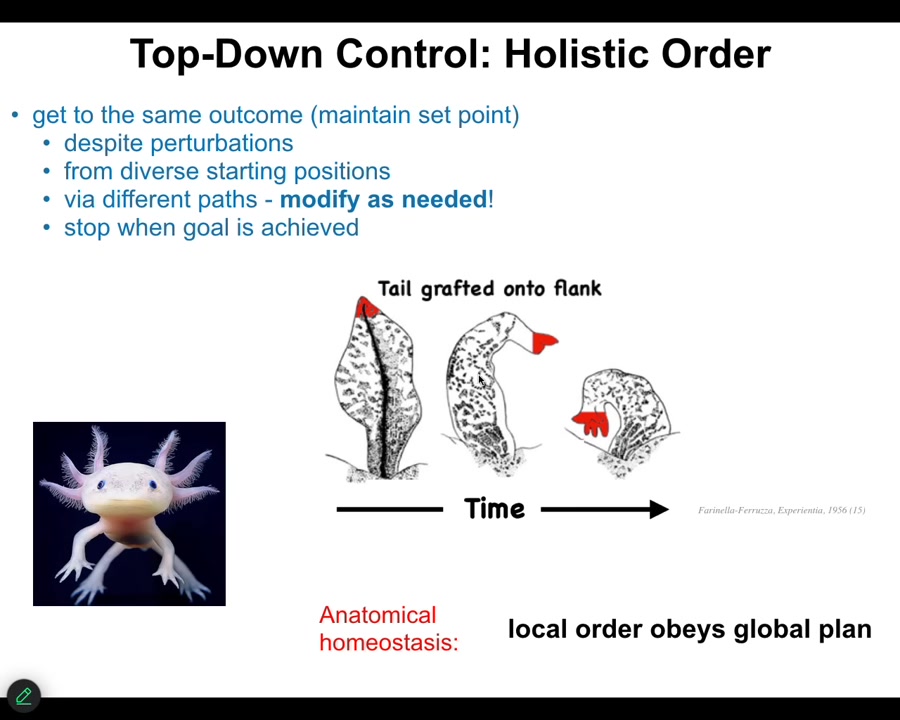 It's not simply the case that molecular pathways did what they did, and then there was emergence, and some complex thing ended up happening. That's true, but that's not the end of the story. It has an important amount of feedback and anatomical homeostasis, because what it can do is reduce error. This is an error minimization scheme. The system has the autonomy to pursue this goal, and when you try to deviate it from that goal, it will keep working towards it, and it will stop when it's done. That's the definition of goal-directedness.