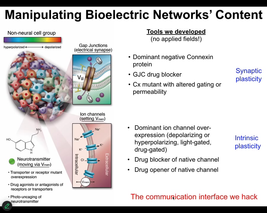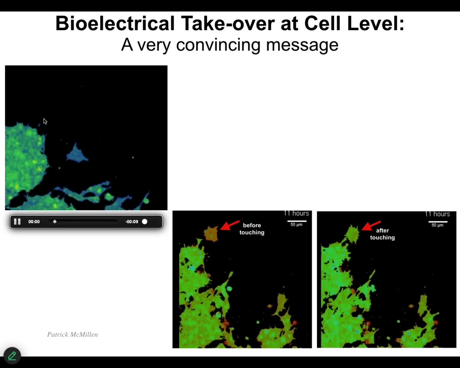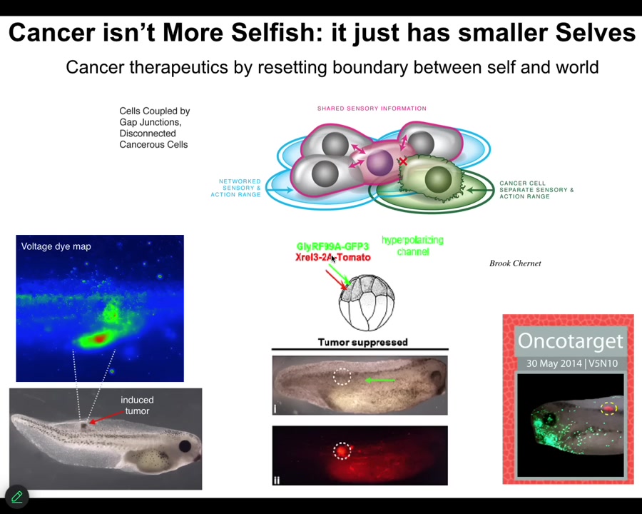 We have a program in cancer that's designed to use these ideas as cancer therapeutics. For example, when individual cells become transformed and they disconnect electrically from the collective, as soon as they disconnect, they don't remember the goals of making nice organs. They're amoebas at that point. They treat the rest of the body as external environment. What we want to do is reconnect them, physically, bioelectrically reconnect them, and we can see when they're disconnecting, here's the bioelectrical map, they're disconnecting. When we reconnect them, even though they're expressing very nasty ONCA proteins here, there's no tumor because these cells are plugged into this giant collective that remembers how to make muscle and skin and useful organs instead of going off and being an amoeba in this environment and reproducing it like metastatically and so on.