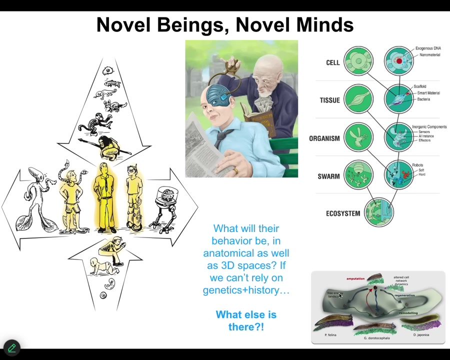 For example, in our work here there are flatworms, these planaria with different shaped heads, and one of the things we can do is take a single species of planaria and bioelectrically prompt them to make heads belonging to other species. So there are these attractors in anatomical space with different shaped heads—flat, round, triangular, whatever. And we can make them because it's not a hardwired kind of thing; rather, the cells make electrically mediated decisions about what shape they're going to be, so we can ask them to go into one of these other attractors, easy enough. These attractors were set by evolution, presumably. But what about novel beings who have not had a history of selection?