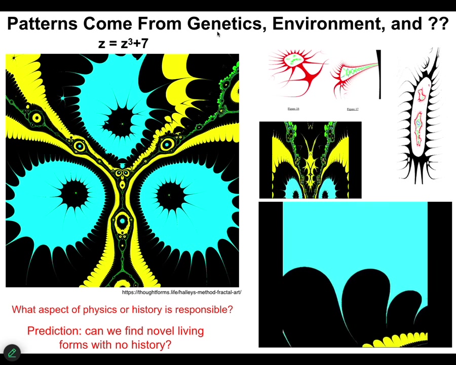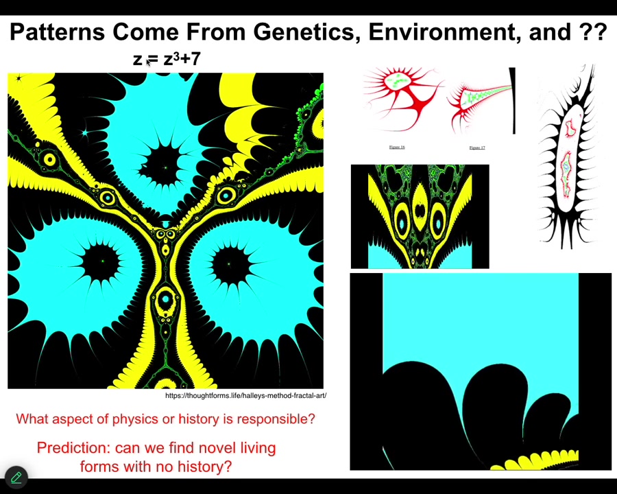 They love history, meaning genetics and environment. In other words, you have a genome that sets specific patterns because that genome has been selected in a certain way and everything else died out in there. But we know that there's another source of patterns that doesn't come from either of those things, neither physics nor history. That's patterns for mathematics. What you're seeing here, this is a very simple function in complex number Z.