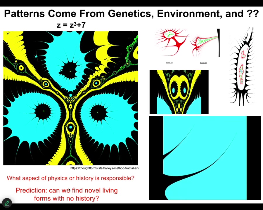 So now the question: can we find or make novel life forms with no history, at least in their macroscopic configuration, such that we can practice this, getting better at understanding what their behaviors and their forms are going to be like?