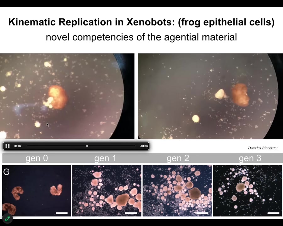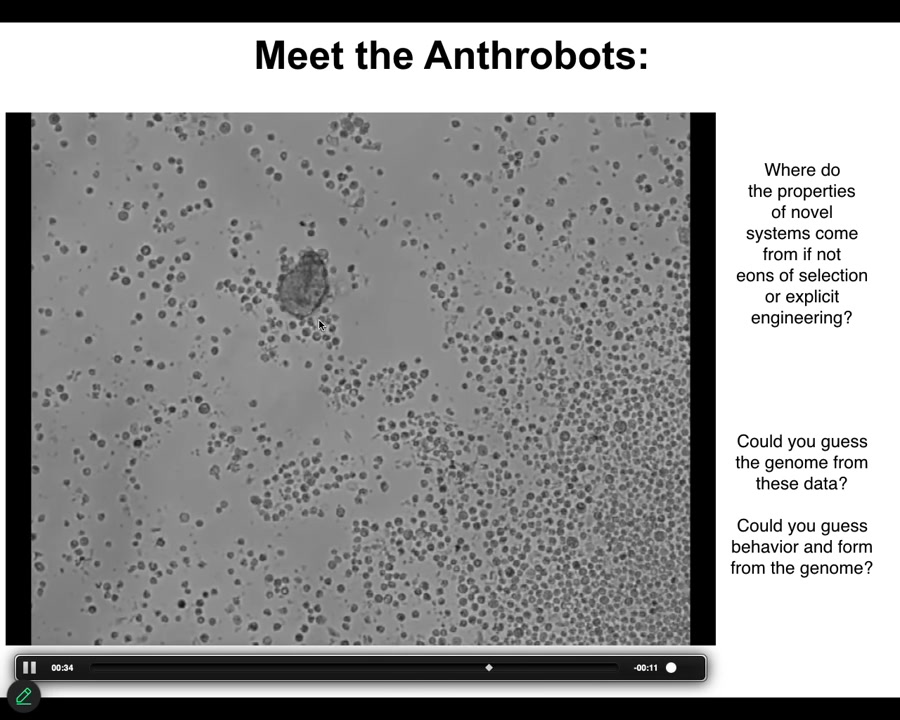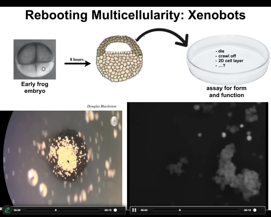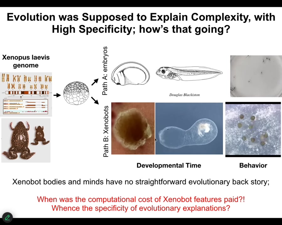 So the big question here is this. We know that the genome can give rise to these sorts of things. So the developmental stages of a frog and then tadpoles. Apparently the frog genome also knows how to make xenobots and their weird developmental trajectories and their behaviors. There's never been any xenobots or anthrobots. There's never been any selection to be a good anthrobot or to be a good xenobot. Where did these things come from?