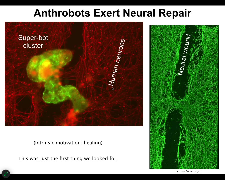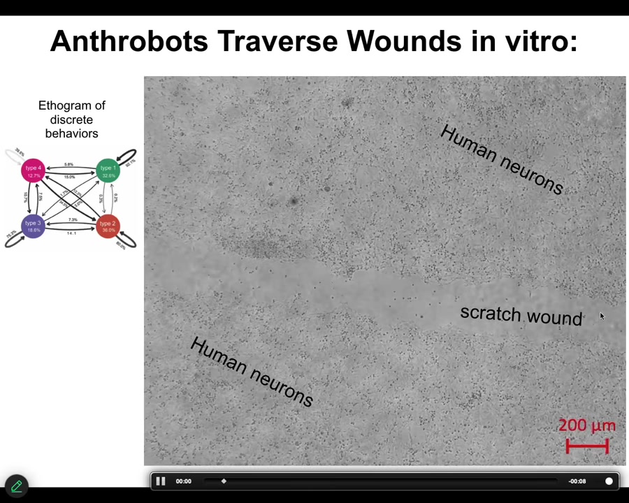And then they have this amazing ability. Here's what you're seeing here is an anthrobot swimming down a scratch that was made in a bunch of human neurons. So here are human neurons plated at the bottom of the dish, and we put a big scratch wound through it.