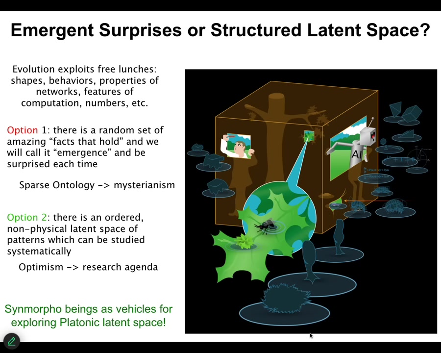 Or you can take another option, which is the option that mathematicians often take, which is to say that no, these are not random things. There is an ordered, structured space of patterns, in particular mathematical patterns, that can be studied systematically. These are not the random surprises that show up. This is a structured space, and we need to understand that space. If you think that way, then a few things follow. First, evolution really heavily exploits some of these patterns as free lunches, things you don't need to evolve because you get them for free from mathematics. There are many that come from shapes and properties of networks and so on. It also means that we can use Xenobots and Anthrobots and various kinds of synthetic bioengineered constructs as vehicles, as tools to peer into this latent space of possibilities and see what is actually there. We know there's one point in that space that represents a frog and one point that's a human. But what's all the stuff between there that their hardware can also make, all these other things? Now we understand, and this is my proposal, that all of these things are exploration vehicles for that space because they're interfaces. Once you make one, and it could be a cell, an embryo, a robot, a biobot, a chimera, a hybrid, whatever, you make these things, they serve as interfaces to specific patterns that are going to then ingress into the physical world and allow us to understand what's going on.