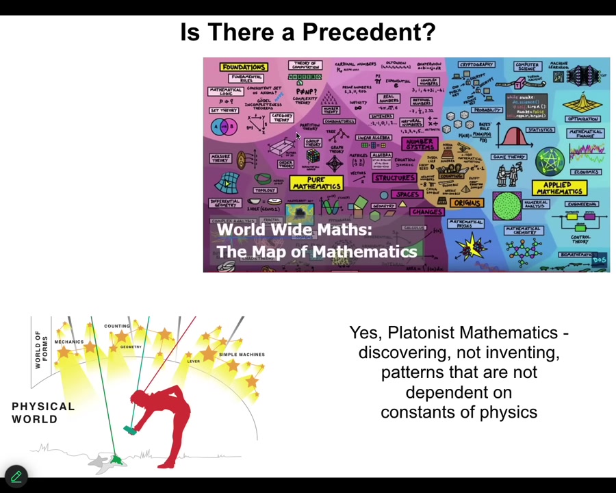 The precedent for this is mathematics. Many mathematicians are Platonists in the sense that they don't think they're inventing from scratch culture-dependent rules. They think they are discovering pre-existing kinds of mathematical structures on which everybody would eventually agree. The question is if there were aliens that were different in body and in mind, would they eventually find the same mathematics that we did? There's a lot of debate over this, but I prefer the Platonist view where I think that a lot of these things are not contingent. They are deep truths that then inform physics and biology. What these mathematicians will say is that there's a latent space that holds specific kinds of objects that are amenable to the study of formal systems.