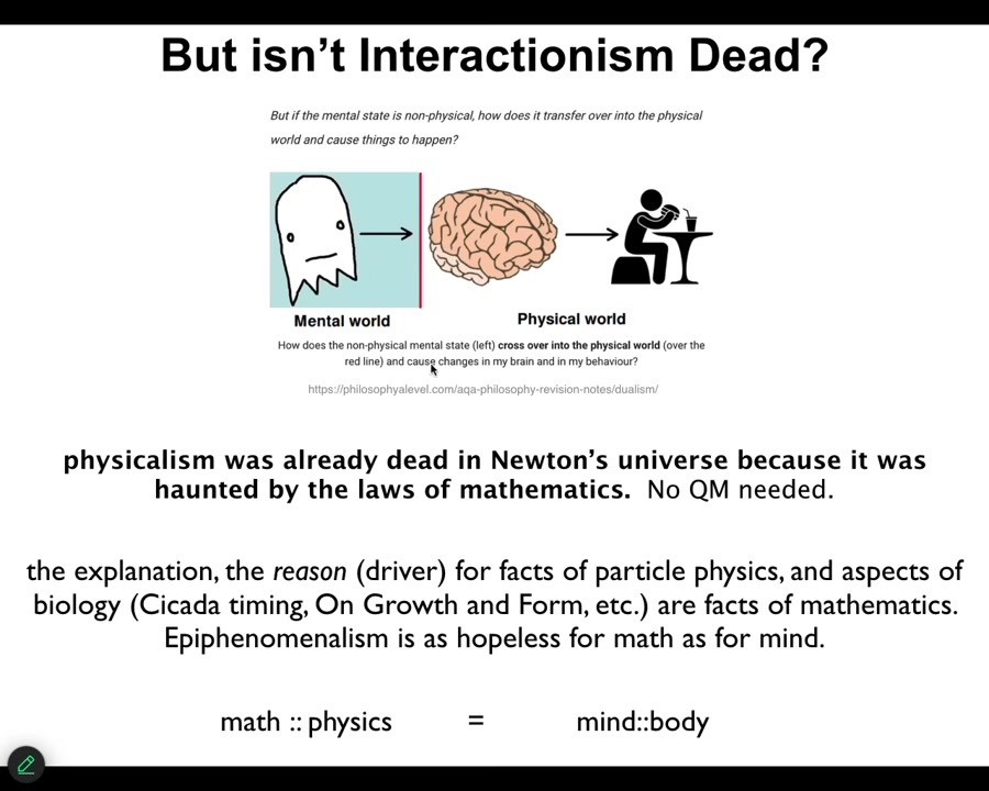 At this point, you might be thinking, that sounds an awful lot like a philosophical position that is long dead, proposed by Descartes, and many ancient thinkers in the East. This idea that there is a non-physical mental world that contains patterns of behavior, and that these interact through the brain or the body and drive behaviors that we see. I don't think this idea is as dead as most people nowadays think it is. I think it's actually pretty necessary. And I think the mind-body relationship is actually the same as the math-physics relationship. In other words, already by the time of Pythagoras, people knew that there were non-physical patterns that affect what happens in the physical world. This interaction was the biggest problem; Descartes was always challenged on it. How can non-physical things interact with the physical brain? We don't know exactly, but that problem has been with us long before we thought about biology or behavior and long before we had quantum mechanical interfaces. Even in Newton's classical universe, we already had non-physical facts of mathematics controlling what happens; they determine, they constrain the physics, they enable biology. This has been with us for a long time. So I really think we need to work on this. It is a serious thing.
