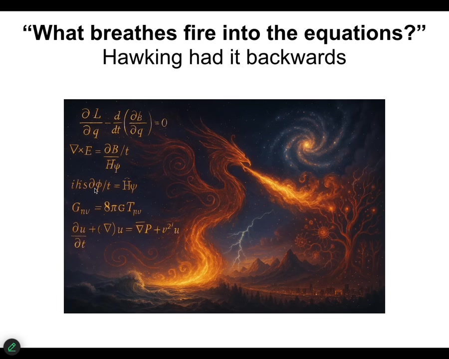 It could be that when Hawking asked what breathes fire into the equations, maybe he had it backwards. You don't need to breathe fire into the equations. It's the equations, or rather the mathematical patterns that we describe using equations; they're breathing fire into the physical world. I think it's backwards.