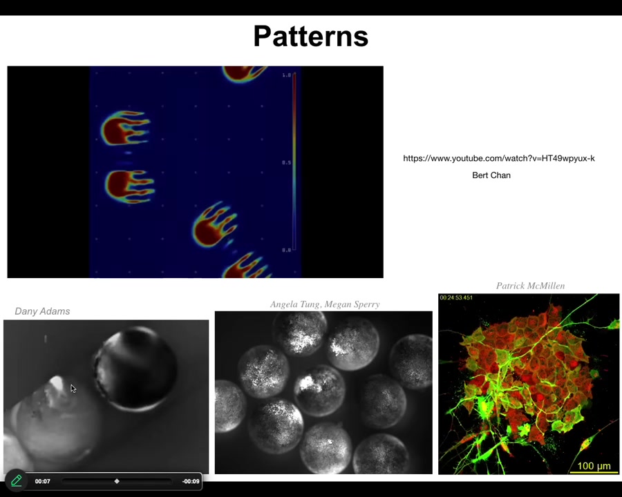 We need to think of where patterns come from. Biologists love two kinds of patterns. They love patterns from physics. In other words, something is round because it has to minimize surface area, so those kinds of things.