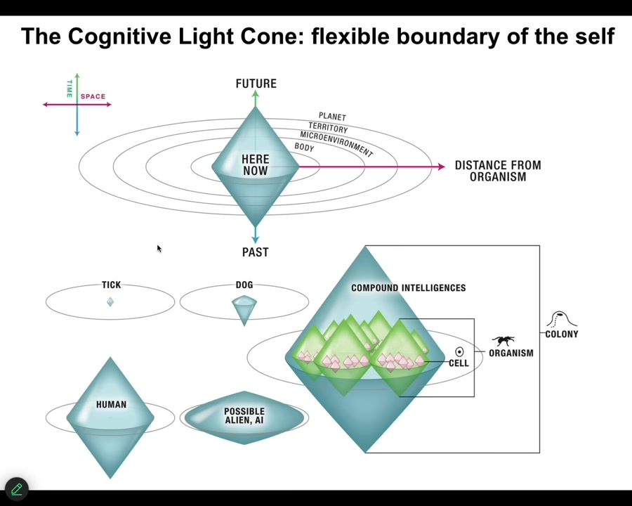 One thing they have in common is the need to demarcate themselves from the outside world, the boundary of the self. What determines the self? We are all collective intelligences, we're all made of parts. What determines that a particular collection of parts is a thing that's different from its environment? One of the things I've claimed is that there's this notion of a cognitive light cone, which demarcates the size of the biggest goal that you can pursue as a system — not how far you can reach with your senses and your effectors, but what is the biggest goal that you can pursue? If you're a system and you can bend your parts to pursue goals, what are the biggest goals that you can pursue? That determines the size of that cognitive light cone and allows the goals that you can pursue to determine where your borders are. You consist of all the parts that have been aligned to pursue specific goals.
