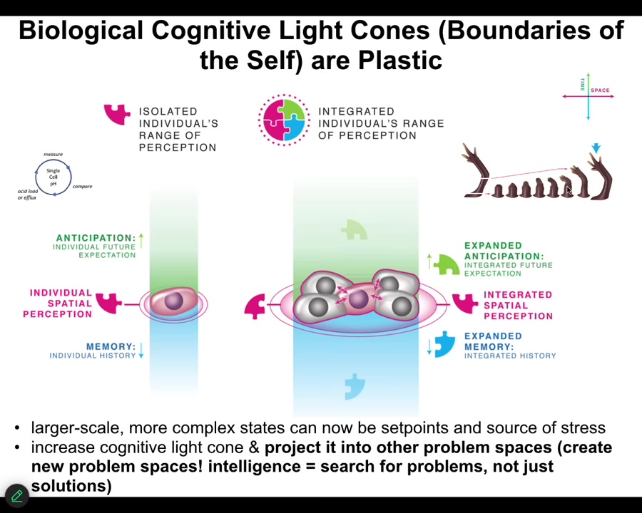 And one of the things about interesting agents is that those goals are plastic. They're not always the same size. So individual cells care about tiny little individual cell things. They have a small cognitive light cone, a little bit of memory, a little bit of predictive capacity. They only care about a very small radius.