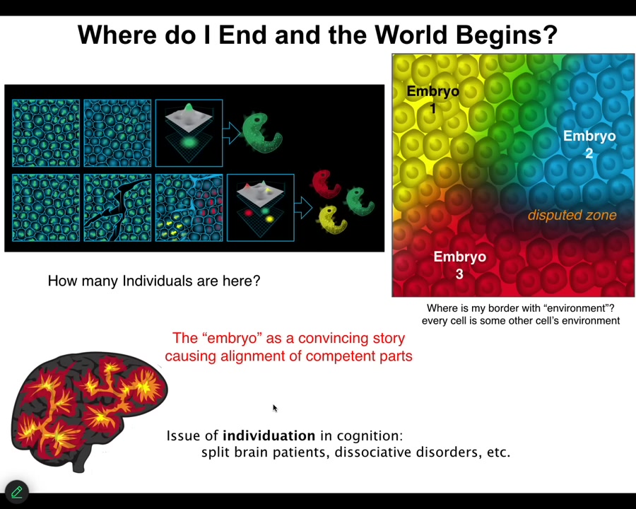 This is also true in cognitive science. There are major issues of individuation. We have split-brain patients and dissociative identity disorders. How many actual individuals can be present in one cognitive medium? It's not set by the genetics. I can take the same embryo and make any number of individuals out of it. This is a dynamic process. Self-construction is really critical.