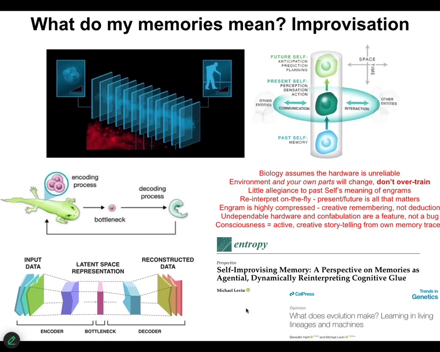The final thing that I want to say that all good agents have in common is the ability to improvise. They have to reinterpret their own memories. They do not know immediately what their memories mean. At any given moment, you don't have access to the past. What you have access to is the memory traces, the engrams that the past has left in your brain or body. At any given moment, you have to reconstruct a story of who you are, what you think of the outside world, what your goals are, what you're going to do from the molecular and physiological memory traces that exist.