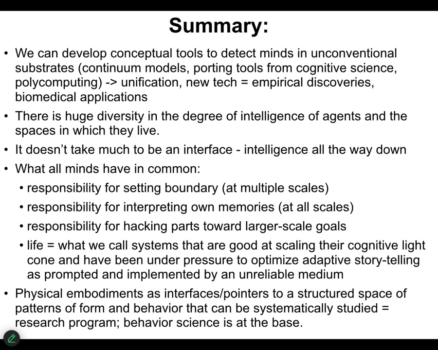 Here's a summary of everything that I've told you today. We can and should develop new tools to detect minds in unconventional substrates. This is going to be a major unification of things that we think of as different, quote-unquote machines, organisms. I think these terms are not serving us well at all. It's going to drive new technologies, biomedical applications, new discoveries and so on.