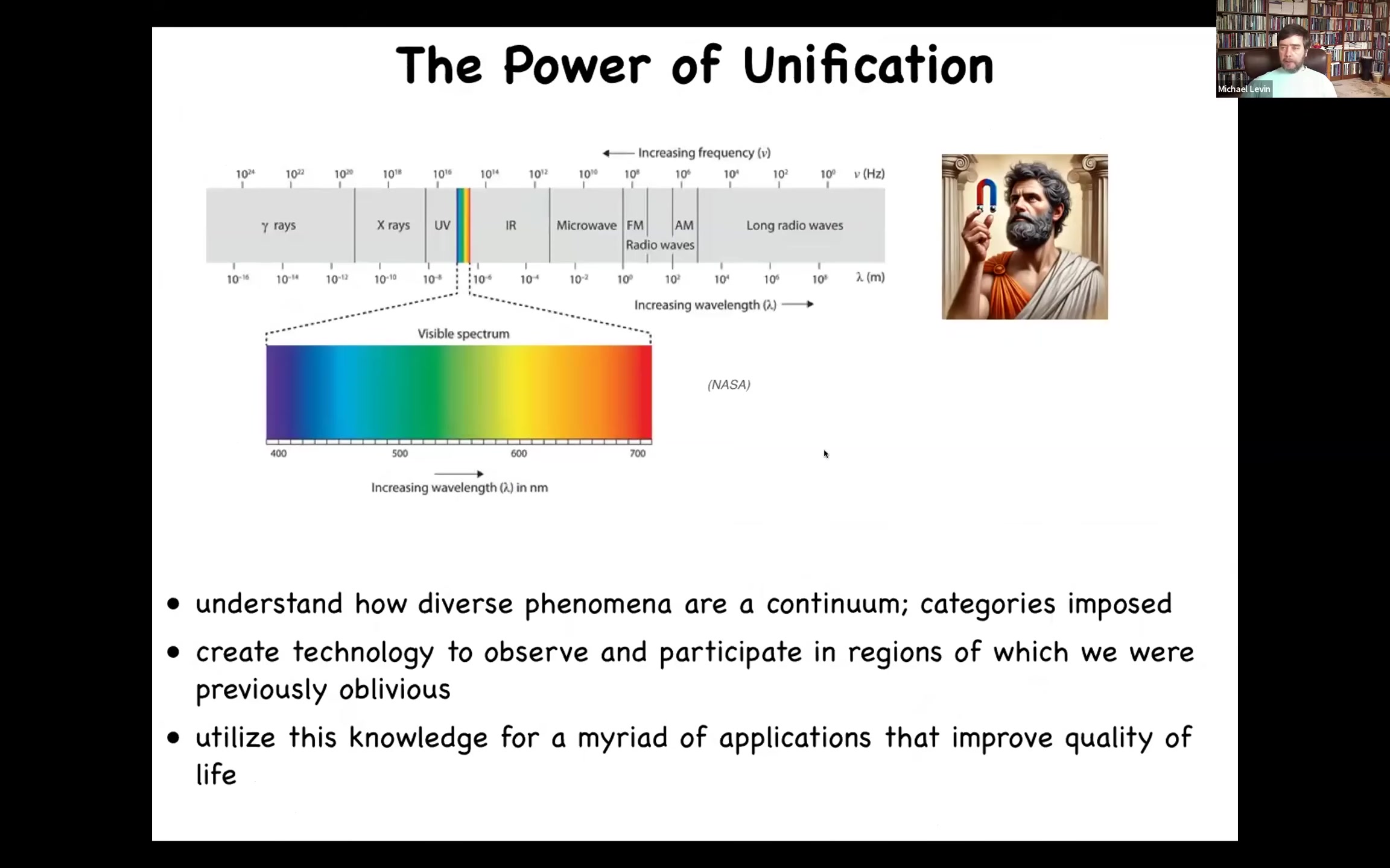 I want to start off by reminding ourselves of something that happened over history: prior to having a solid theory of electromagnetism, we had static electricity and we had lightning and we had magnets and we had light. We all thought those were different things. We thought these were completely different kinds of phenomena. We were also unaware that we actually were only sensitive to a tiny part of this spectrum. What a good theory of electromagnetism did for us is several things. First of all, it revealed that all of these different things are in fact manifestations of the same thing and that it is a spectrum and that the labels we put on this spectrum are convenient, but they're for our purposes. The underlying thing is a continuum. And it allowed us to develop technology driven by the theory that now lets us interact with this enormous range of things in the universe around us to which we were previously completely blind. And that allows us to make applications that improve quality of life.