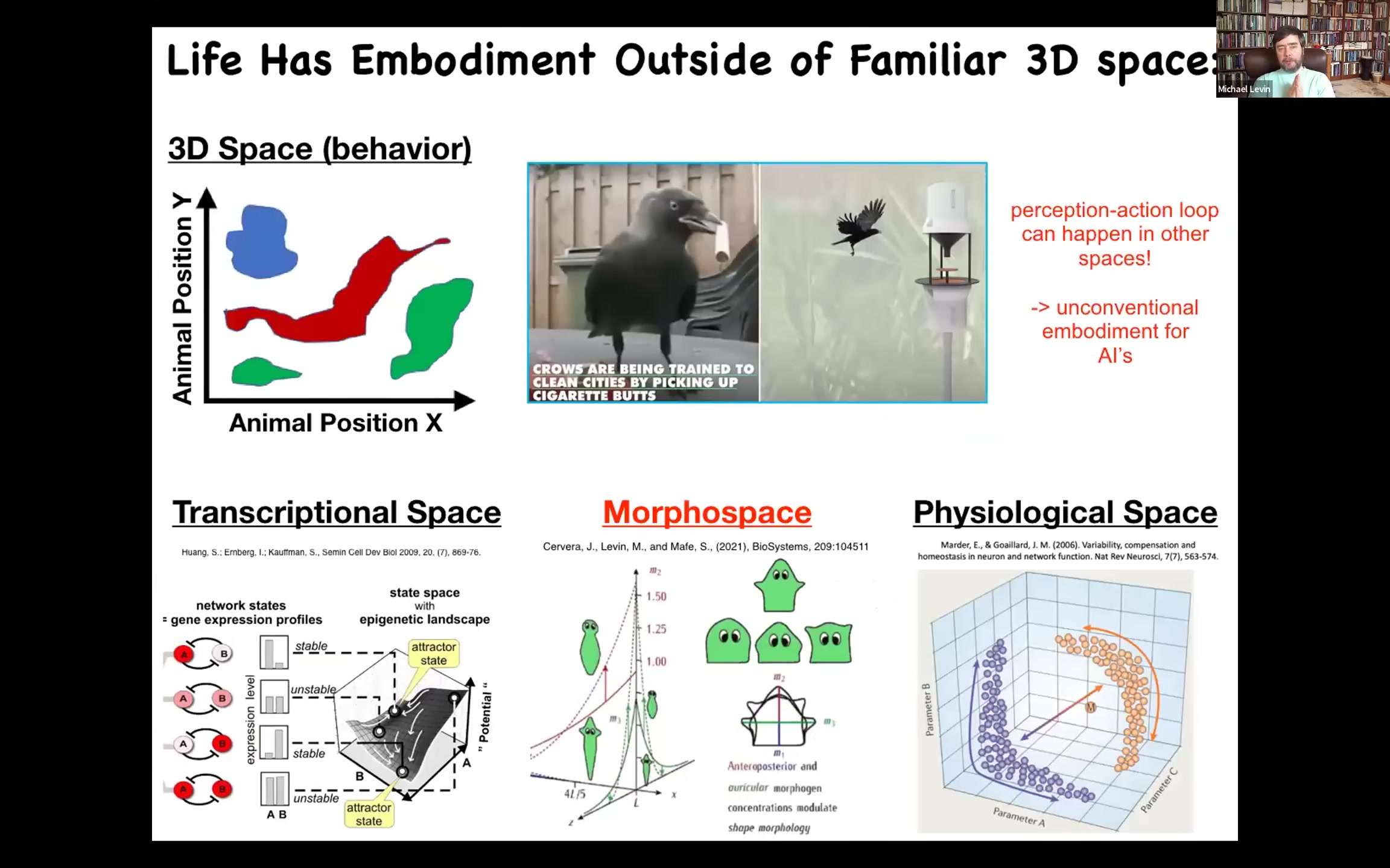 More generally, what evolution, I think, has done is to pivot some of the same navigational tricks across all kinds of spaces as life got more complex. So from metabolic spaces, physiological spaces, gene expression spaces, eventually multicellularity, and you get anatomical amorphous space, then muscles and brains appear, and you've got 3D behavioral space, and then eventually linguistic spaces.