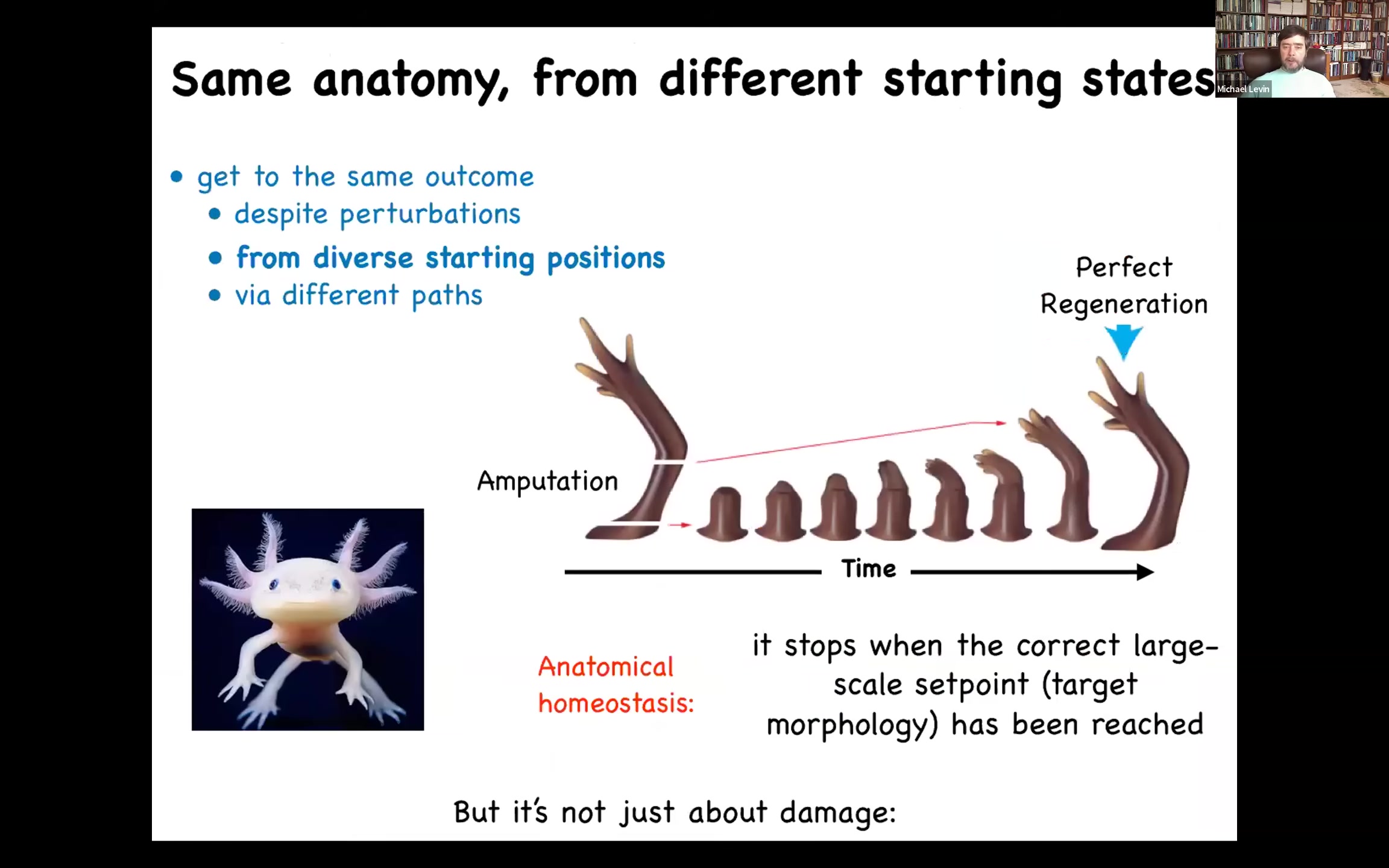 I don't even just mean reliability, I mean problem solving. Here's a very simple example of a goal-directed system. You have this axolotl. They are incredibly regenerative. They can restore most of their body parts. If it loses a limb anywhere along this axis, the cells immediately detect that they've been deviated from their target state. They will work really hard to get back there. The most amazing thing is they stop when they're done. When do they stop? They stop when a correct axolotl limb has formed.