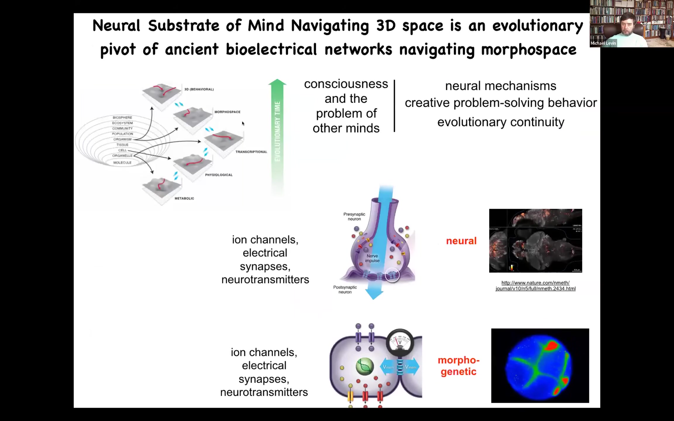 The interesting thing here is that what our brains are using to embody conventional cognition is exactly the same molecular mechanisms, meaning ion channels, electrical synapses, and neurotransmitters, exactly the same machinery as the collective intelligence of the body uses to make anatomical decisions. This is interesting.