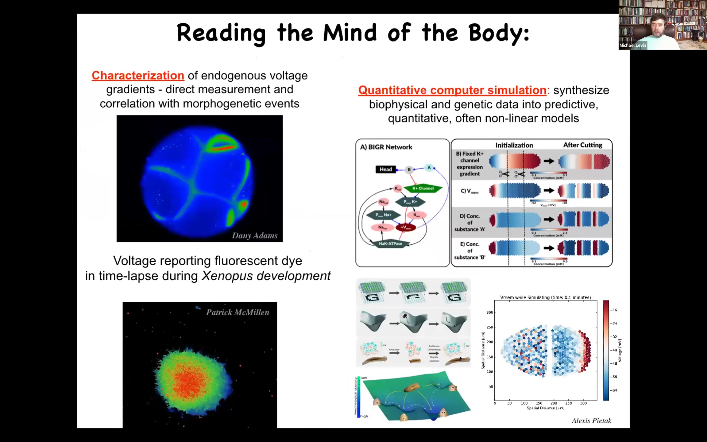 You can see all the electrophysiology that goes on as these cells figure out who's going to be left, who's going to be right, anterior, posterior. So we have all kinds of computational methods that we've developed to model this phenomenon and to understand how it can underlie memories and large-scale circuits that do pattern completion, which is regeneration. You lose a part of the body and then you can complete that pattern later. So we have all kinds of simulations.