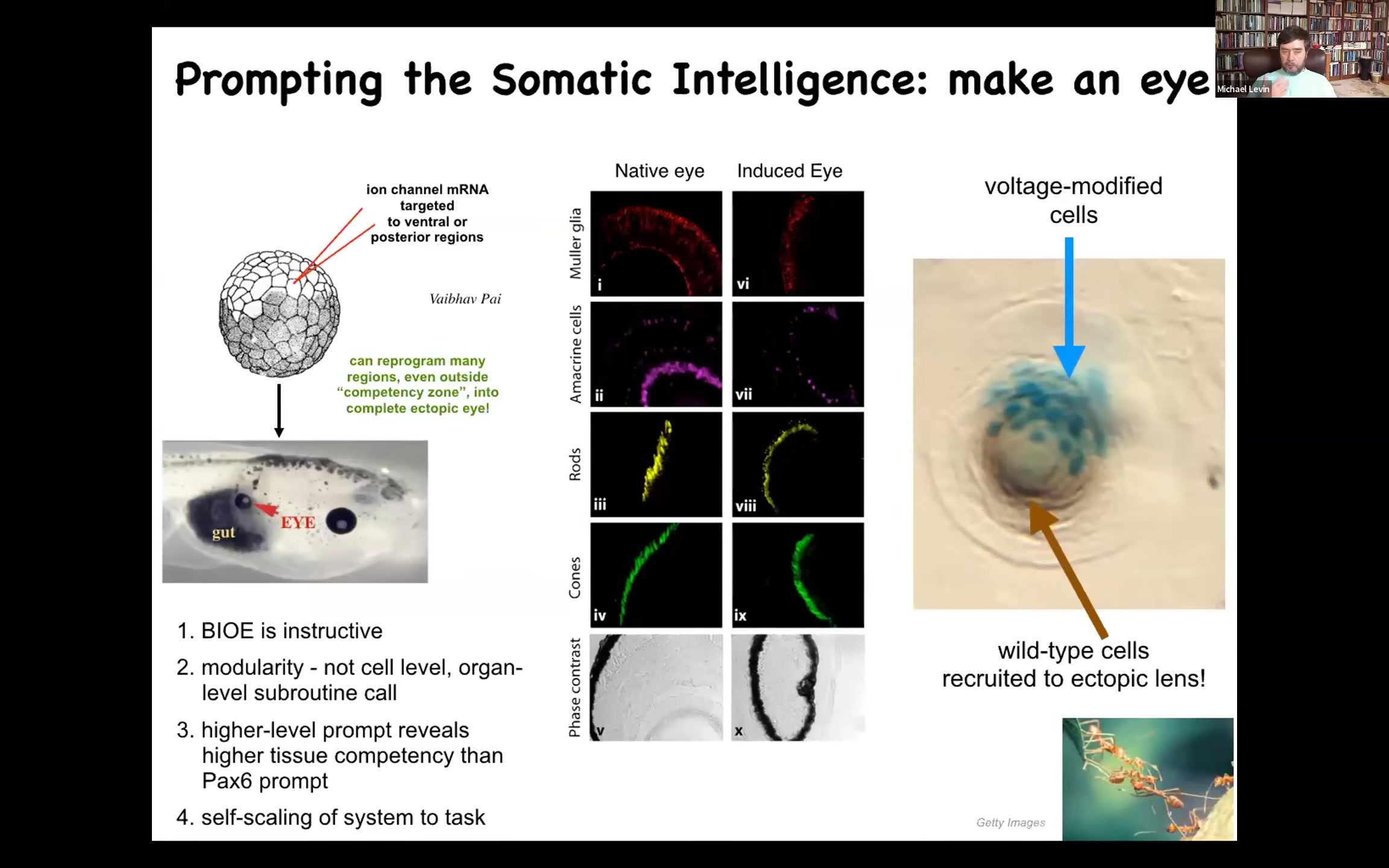 You have to be able to convey messages too. This is one example. I could show you hours of this kind of stuff where what we can do is say to some cells that are going to normally make a gut, give them the message that says, make an eye. That message is encoded electrically. We introduce it using ion channel, potassium channels encoded by RNA that make a little voltage gradient that looks just like that eye spot that I showed you a minute ago. Sure enough, the cells get the message and they make an eye.