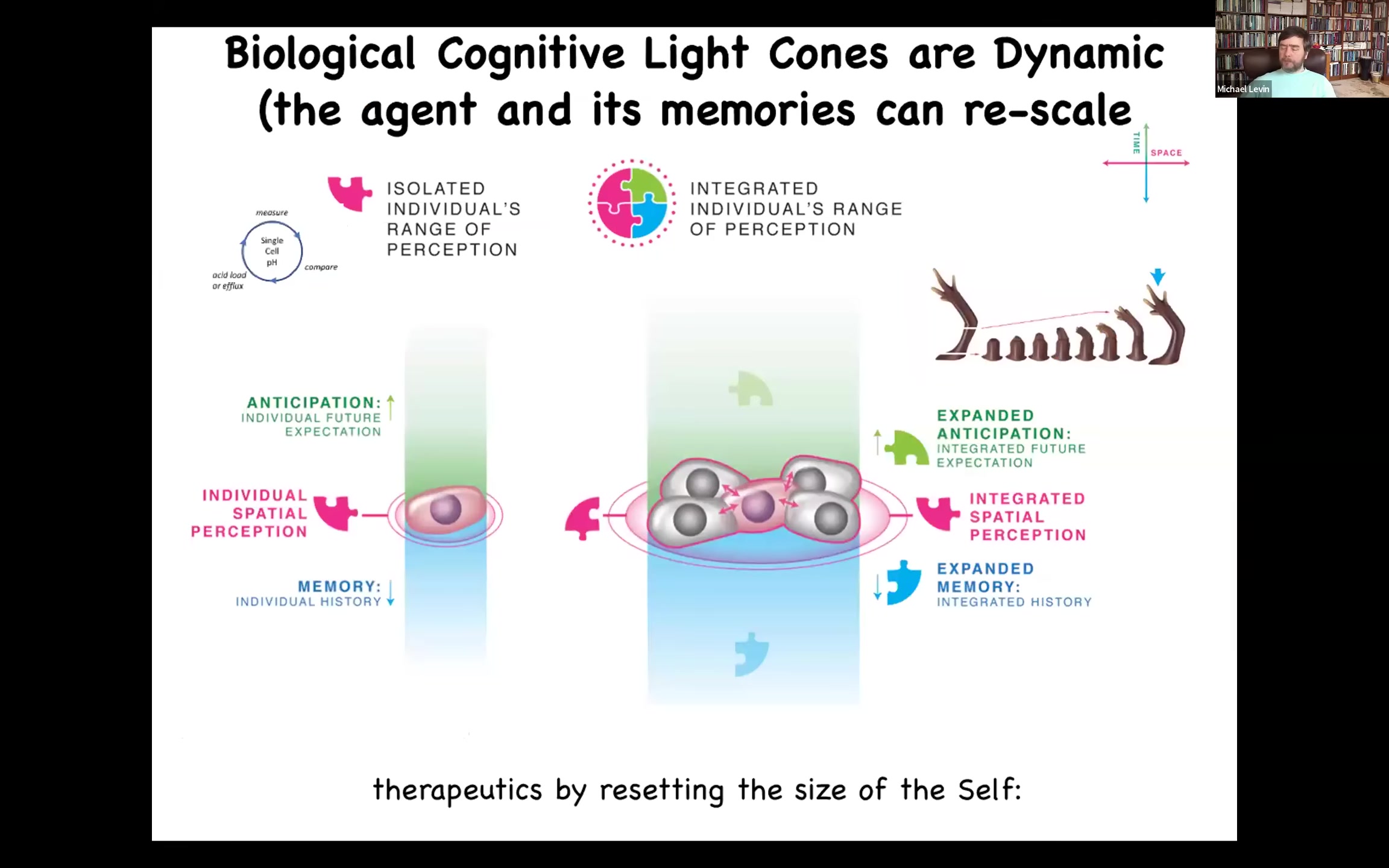 There's this question: can we show how connecting cells into a larger network allows them to have larger goals? How do you expand the size of the cognitive light cone? This weird way of thinking about it has therapeutic benefits. We try to show practical implications for all this strange stuff that we say so that other people can see why it's useful to think about it this way.