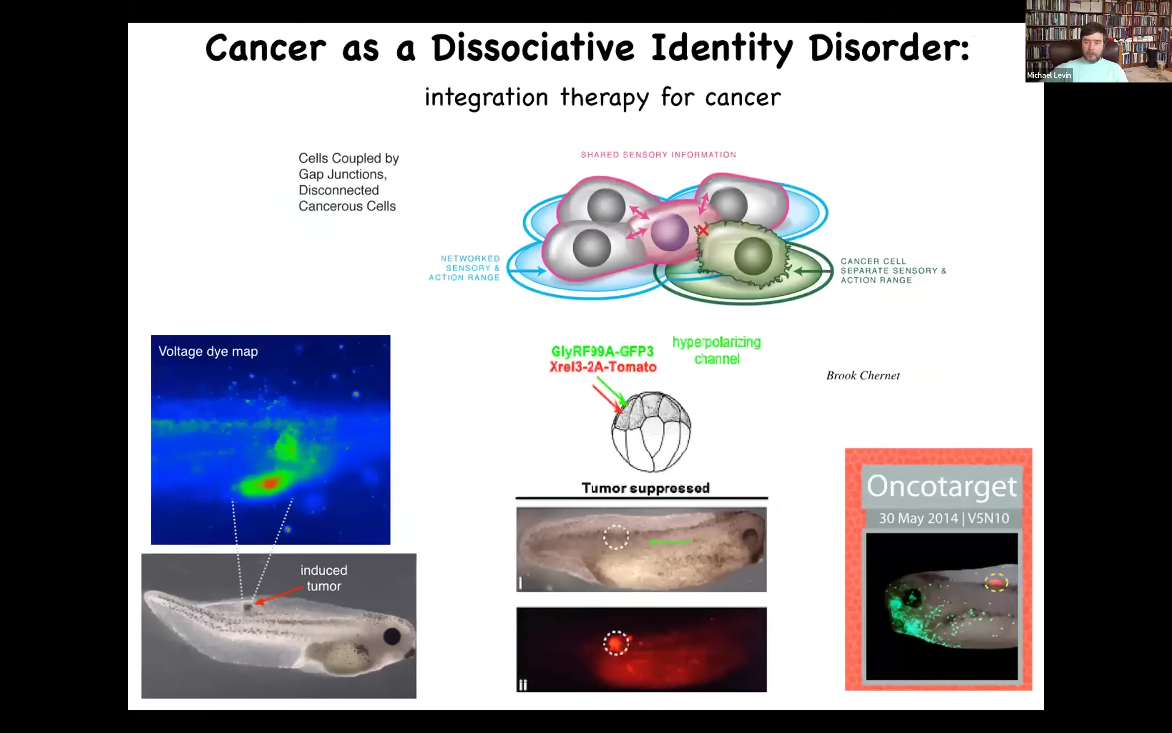 Here's a human oncogene injected into a tadpole. It normally makes a tumor. It's because oncogenes make the cells disconnect electrically from the rest of the network. When they do that, as far as they're concerned, the rest of the body is just external environment. It's not that they're more selfish, it's that they have smaller selves. The border between self and world shrinks, and whereas before it was part of this big collective that could entertain thoughts about building a proper skin and muscle, now it's just an amoeba doing its thing, so metastasis.