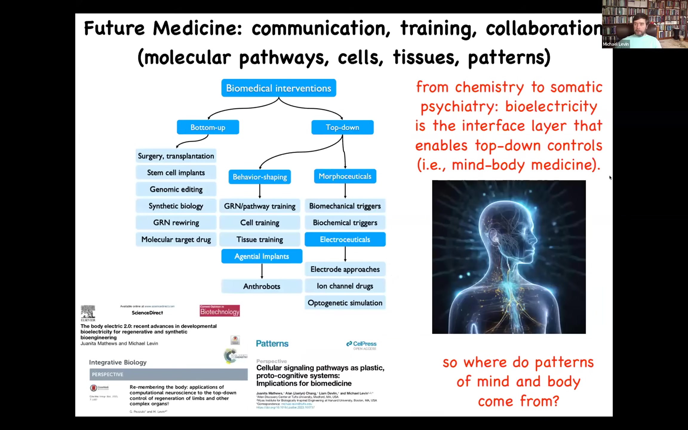 All of this way of thinking about it suggests to me a different kind of biomedicine. Everything that we do today is mostly bottom-up. It's focused on the hardware here. If we actually focus not only on the software, but on the intelligence inside the agential material of life, you end up with all kinds of applications. Most of this I didn't get to show you, training cells and tissues and top-down communication via electroceuticals. I think the future medicine is not going to look like chemistry. It's going to look a lot more like somatic psychiatry. Bioelectrics is one interface layer. No doubt there are others. There are biophotons and other things that probably will be developed. The most well-developed at this point is bioelectricity.