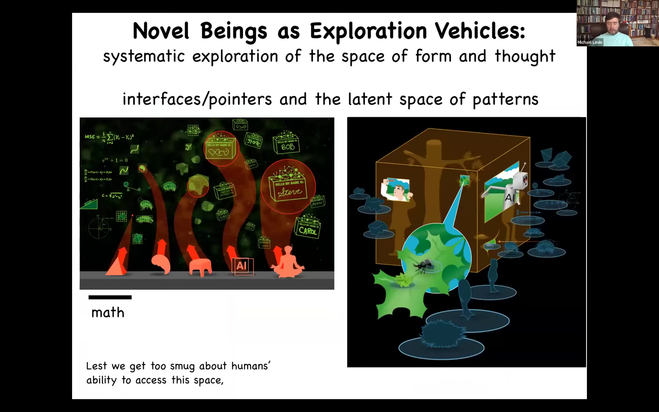 So I think all physical objects, including cells and embryos and bodies and robots and everything, all of these things are physical, are interfaces or pointers into a space of pattern. Mathematicians have known this for a long time. They study one region of that space, and there's all kinds of truths and patterns of mathematical objects that don't come from the physical world. But I actually think it's a much richer space and it contains other very high-agency patterns that we recognize as kinds of minds. And everything that we do is basically poking holes in this separation between the interfaces and the patterns that are then ingressed through these interfaces.