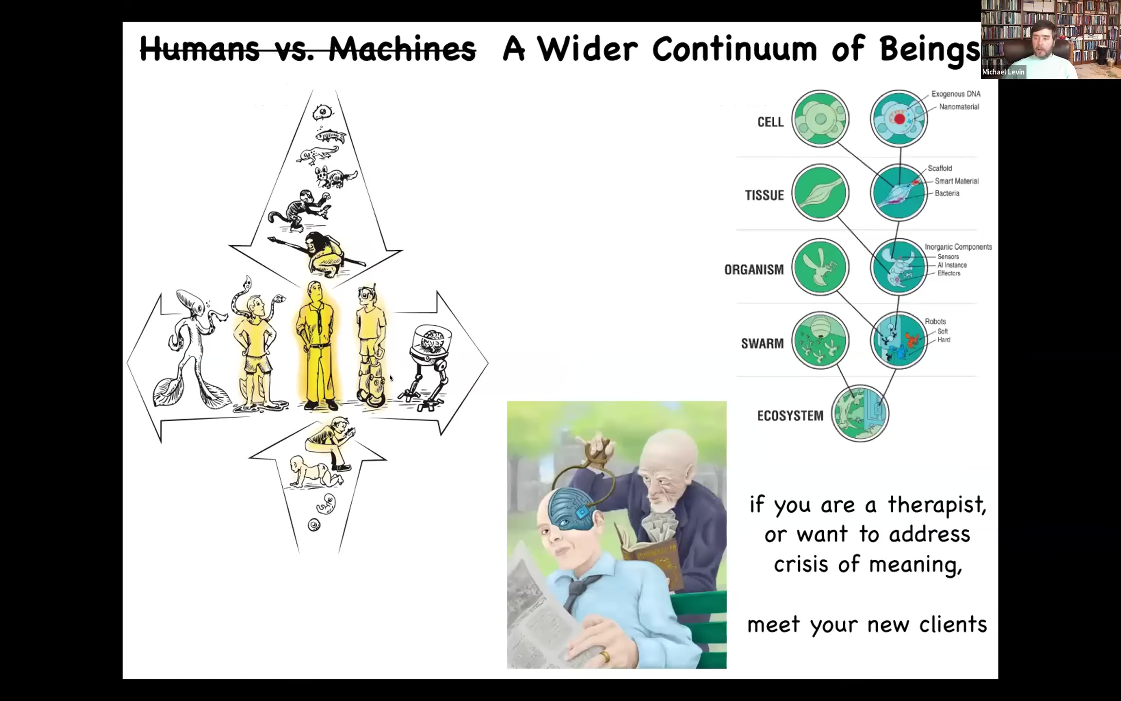 So we are at the center of all kinds of continua, both developmentally, evolutionarily. Whatever you think that humans are or can do, you have to have a story for where does it come from and how does it scale? In fact, both with biological changes and technological changes, the standard human category becomes extremely diffuse because of the plasticity of life that allows it to be interoperable with all kinds of modifications. If you in the audience, if you're a therapist or you're interested in the crisis of meeting and helping people through this, you've got a set of constituents that count on you for help, you really have to start thinking about here are your patients of the future. The standard human patient is not enough. There are going to be all kinds of interesting new beings with all kinds of needs that we are going to have to address in some way. Some of these will have the same existential concerns as us, some will have very different concerns.