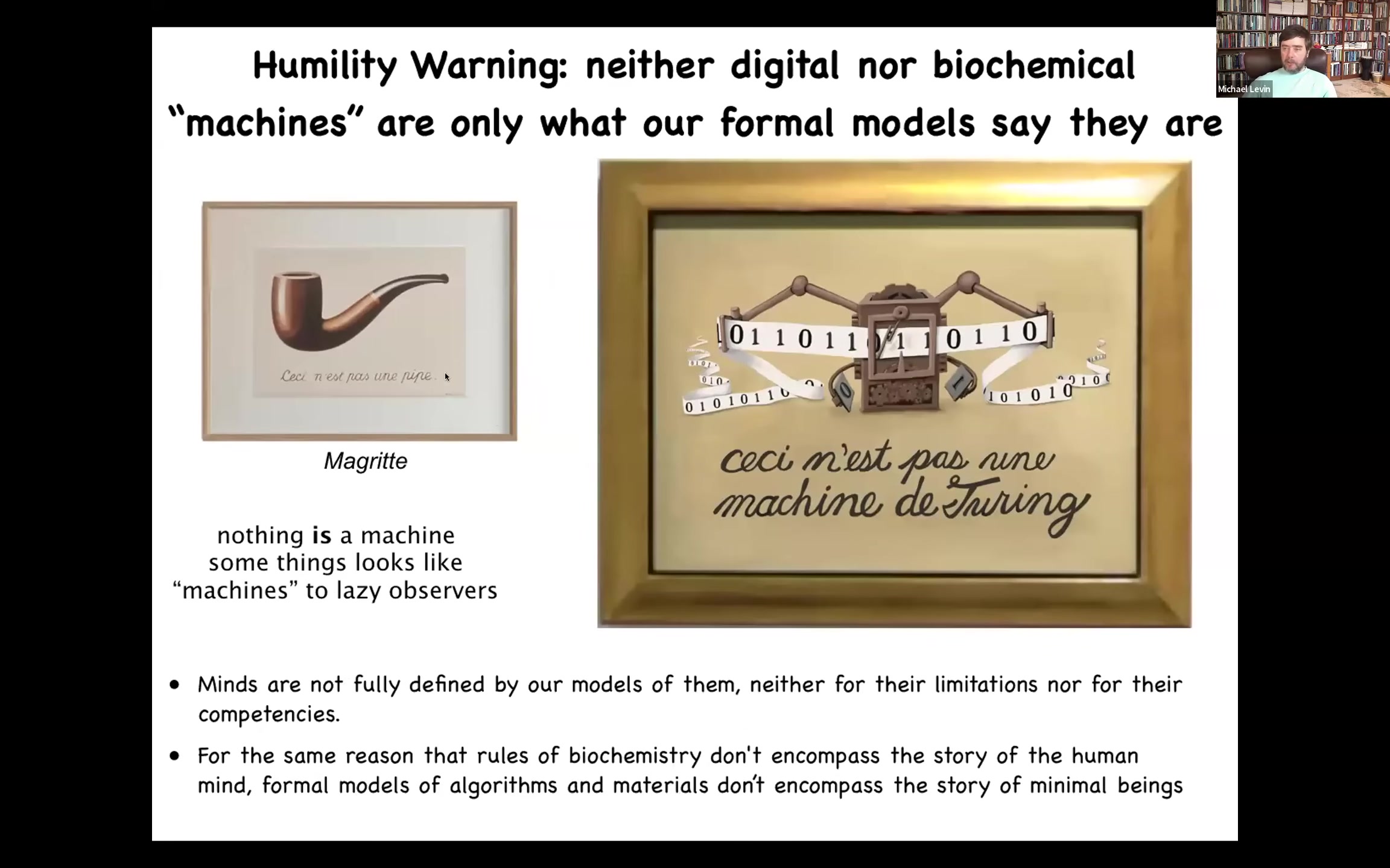 And so Magritte was telling us that our formal models are not the thing itself. I would say the same thing. There's a lot of organicist thinkers who are down on computationalism and they say, living things aren't machines. And they say nothing is a machine because a machine is a formal model that humans have defined to handle certain aspects of what physical objects do in the world. And it doesn't fully describe even the simplest kinds of systems, never mind the biological systems. So nothing is a machine, but some things look like the machines, like a machine to lazy observers. And I think for exactly the same reason that the rules of biochemistry don't encompass the story of the human mind, formal models of algorithms and materials do not encompass the story of minimal beings. I think we have to get much wider in our perception of what we can relate with.