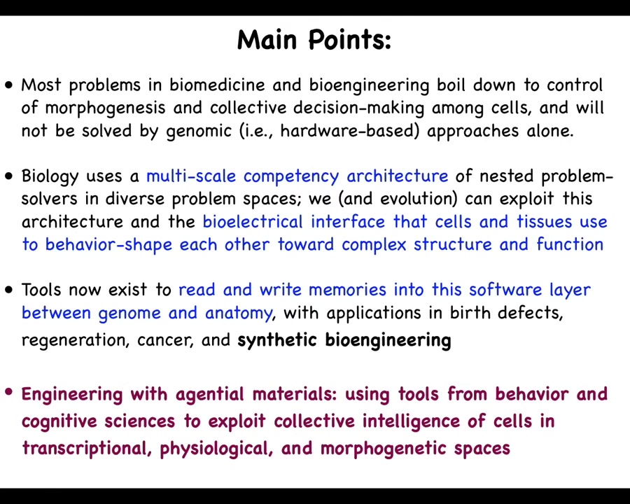 We now have tools to read and write the pattern memories of the software layer of life, that layer that sits between the genome and the anatomy. There are numerous applications in birth defects, regeneration, cancer, and synthetic bioengineering. In particular, the main message of today is that when you are engineering with agential materials, you can use tools from the behavioral and cognitive sciences to exploit the collective intelligence of cells as it operates in these problem spaces.