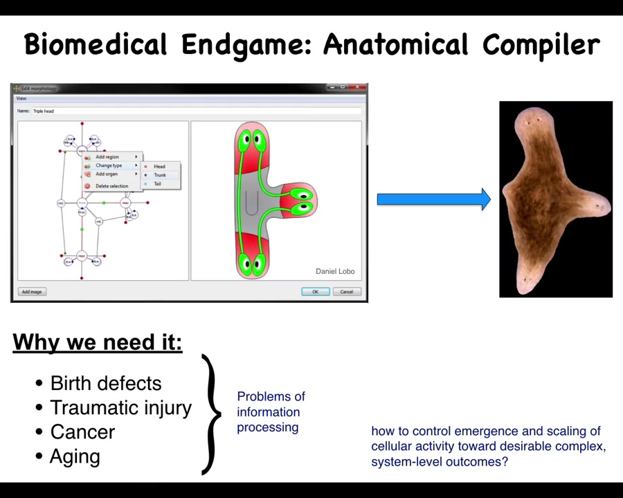 So let's work backwards from what I think is the end game of biomedicine. Someday, you will be able to sit down in front of a computer and draw the animal, plant, organ, biobot, any kind of living system that you want, draw it at the level of anatomy, not at the molecular biological level. And what the system will do then is to compile your goal, your description, into a set of stimuli that would have to be given to cells to get them to build exactly this, in this case, a nice three-headed flatworm. If we had this, all of these things would go away. Birth defects, traumatic injury, cancer, aging, degenerative disease. All of this would go away because we could tell cells to build and rebuild all the complex, healthy structures that we need. So how would we do this? And in particular, why don't we have anything like this? Molecular biology and genetics have been going very strong for decades.