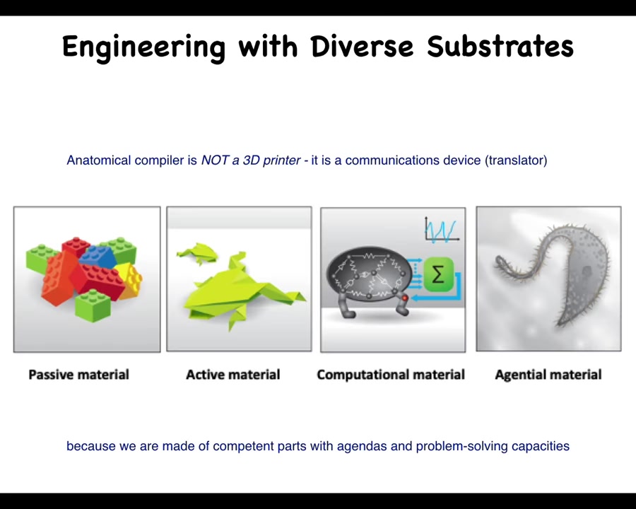 I'm going to argue that here's what's happening: this anatomical compiler, this thing that's going to allow complete control over growth and form, is nothing like a 3D printer. It is not about micromanaging the details as you would when you were engineering with a passive material such as Legos, where you're in charge of every single piece. It's a communications device because in biology we are not dealing with active matter or even just computational matter. We are dealing with an agential material because we're made of competent parts with agendas and problem-solving capacities. The goal is to transmit the needs of the regenerative medicine worker or bioengineer to the collective intelligence of cells so that is what they build.