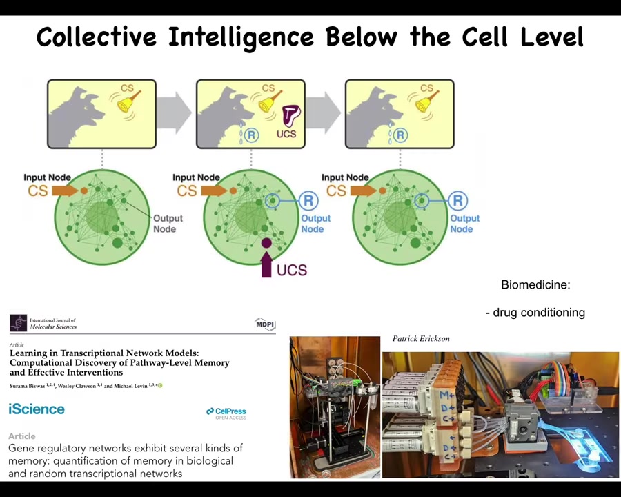 Now, I will point out that there is even intelligence below the cell level, meaning that it's not just that the individual cells are competent, but even below the cell level, there are pathways, gene regulatory networks and other biochemical pathways that you may think of as mechanical, as deterministic, hardwired kinds of things. But in fact, if you pay attention, it turns out that they are capable of learning. They show about six different kinds of memory, including Pavlovian conditioning. Not neurons, not brains. You don't even need the cell. It's the molecular networks themselves that can learn. And in our lab, we are currently building devices to take advantage of the learning capacity of cells and do things like drug conditioning and other ways to control the molecular pathways, memories, and the expectations that they have and how they deal with future stimuli and so on.