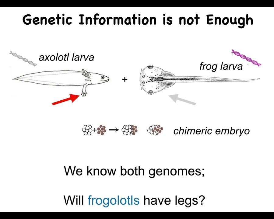 Now I ask you a simple question. Given this, can you tell me if a frogolotl is going to have legs or not? And if it is going to have legs, are those legs going to be made entirely of axolotl tissue or some of the components will be frog cells? And the answer is there's no way to tell. We have no way of knowing from this genetic information what's actually going to happen here.