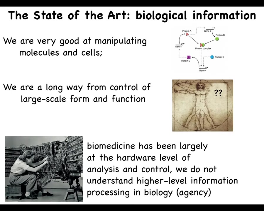 Discussing the context that most problems in biomedicine and bioengineering really are fundamentally about the control of shape, and in particular about the collective decision-making among cells. I will argue that this is not going to be solved by hardware-based approaches such as genomics and molecular biology, but it's going to require thinking that comes from the cognitive sciences. Because biology uses a multi-scale competency architecture. We consist of nested problem-solving agents that work in all sorts of unconventional problem spaces. Engineers and evolution exploit this architecture, and it's this bioelectrical interface that allows cells to behaviorally shape each other towards creating and maintaining complex anatomical form.