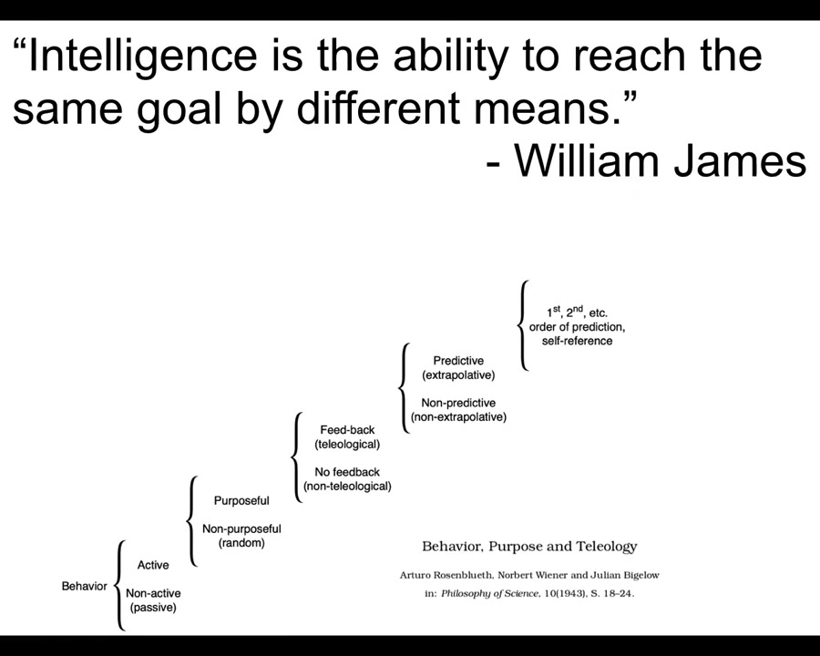 Here we have to have a definition. I've already used this word a couple of times. I'll use it many more times. Here's what I mean by intelligence. It's William James's definition, which is the ability to reach the same goal by different means. Notice it doesn't say anything about brains. It doesn't say anything about what kind of goals or what space, what problem space your goal is in. It's the ability to navigate some problem space to get your goal met despite various perturbations, barriers, novelty.