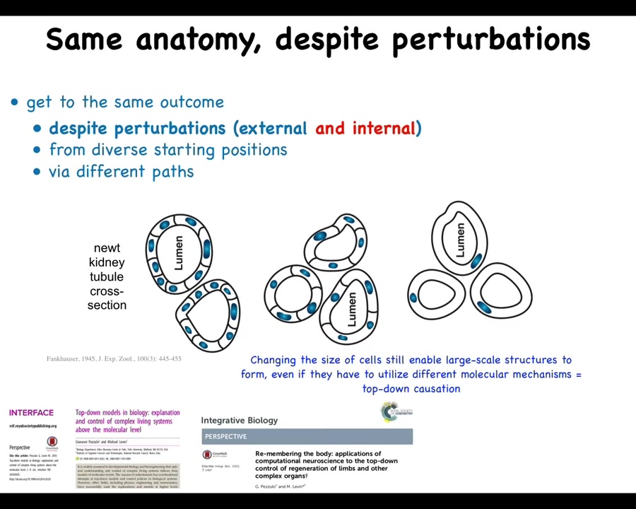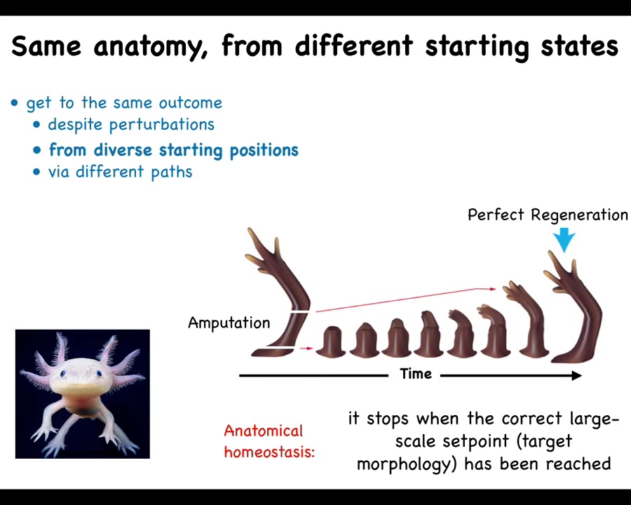 Now just think of what this means. If you're a newt coming into the world, what can you count on? We know you can't count on your environment, and we know you might get damaged, and so it makes sense that you regenerate. But it can't even count on its own parts. You don't know how many copies of your genome you're going to have. You don't know how big your cells are going to be. Your own parts are unreliable, and yet you have to have the goal met. This is what I mean by intelligence. It's literally creative problem solving. It's the ability to handle novel situations by using the tools that you have in new ways.