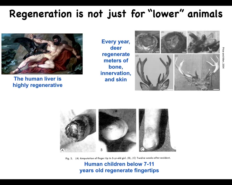 This kind of regeneration is not just for so-called lower animals. The human liver is highly regenerative. Every year, this animal, deer, will regenerate huge amounts of bone, vasculature, innervation as it regrows the antlers, up to a centimeter and a half of new bone per day. It's an amazing regenerative rate.