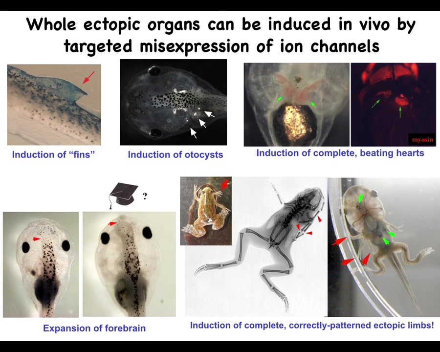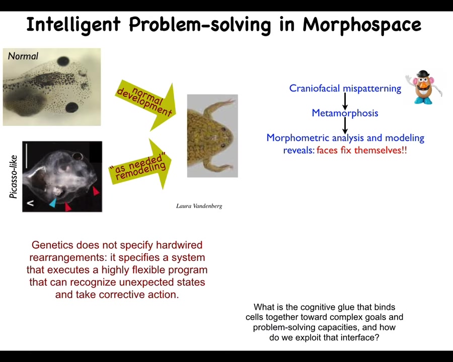 That brings up two questions with a common answer, which is, first, what are the mechanisms—you can call them cognitive glue—that allow individual cells to work towards large-scale outcomes? No individual cell knows what a finger is or how many fingers you're supposed to have or where the eye goes. Individual cells don't know this, but the collective absolutely does. I've shown you a number of examples where you can see they know exactly where they're going in that anatomical space. So what enables that to happen? And how do they know what the goal is? It's one thing to form a collective that knows more things than its parts, basic collective intelligence, but how does it know what the correct frog looks like?