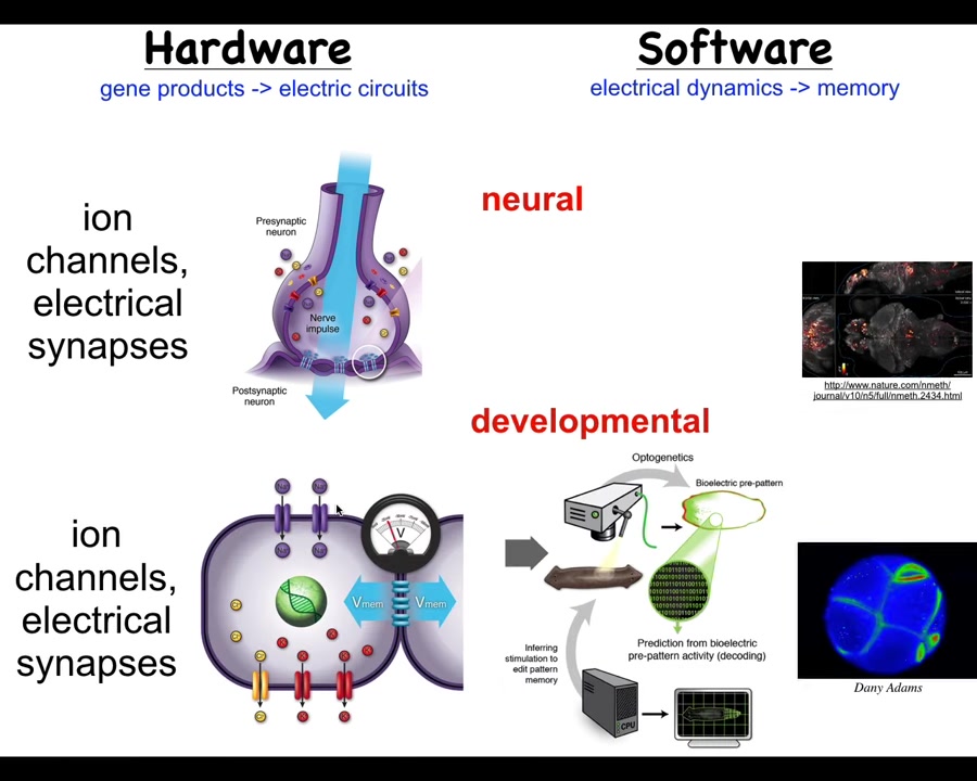 It's not about brains at all. Evolution discovered this around the time of bacterial biofilms. Every cell in your body has these ion channels. Most cells have electrical synapses between their neighbors. Now we can run the same kind of program.