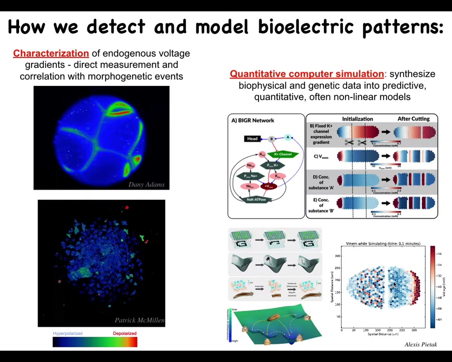 We also do a lot of quantitative simulations. For example, we can try to understand how the gene regulatory networks that express channels result in excitable tissues that can form patterns and how these patterns repair after damage, as pattern completion in both neuroscience and machine learning. We have these architectures where if you're missing part of the input, the system can reconstruct what goes there. We do a lot of computational modeling like that.