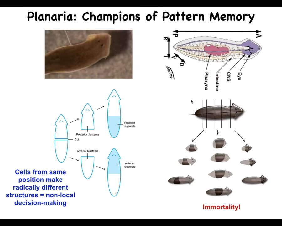 So these are planaria. These are flatworms that have a true brain, they have a central nervous system, bilateral symmetry, and so on. One of the amazing things about planaria is that you can cut them into many pieces. The record is 276. When you do, each piece regrows a perfect tiny little worm. There's all kinds of interesting problems. If you cut them in half, these cells up here have to make a new tail; these cells up here have to make a new head, but they were neighbors up until the time you cut them. How do they have these different anatomical positions, anatomical identities, rather? That tells you it's not local decision making. You can't, from the position because that's identical here, tell what you should be. How does each piece know how many heads it should have and which end should be a head, which end should be a tail?