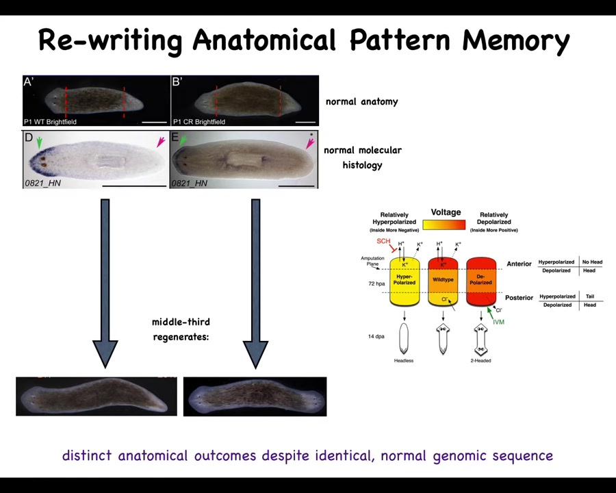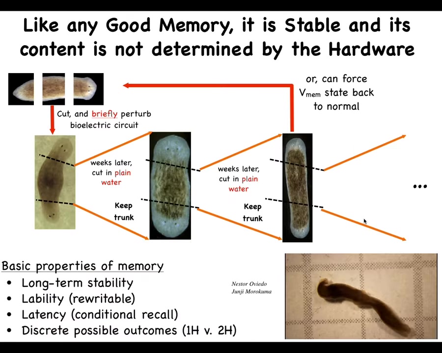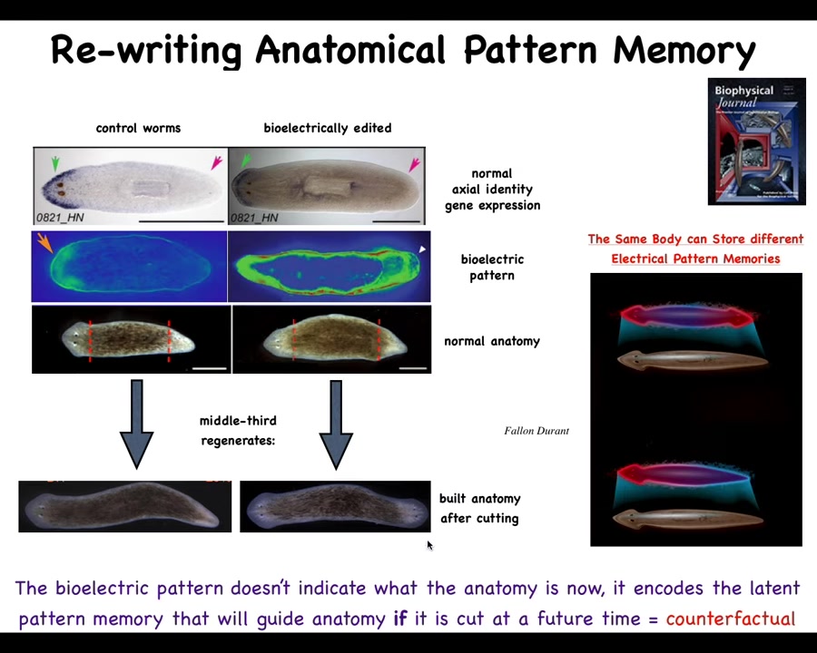 So this is a kind of counterfactual memory. It is possibly the basis of what we have in brains, which is this amazing time travel. It's this ability to remember things and envision things that are not happening right now. This electrical network is able to do that. It's able to store a pattern that is not the same as the current anatomy. The body of the flatworm can store at least two different representations, two different plans for what a correct planarian is supposed to look like. No doubt there's more, but this is what we've nailed down.
