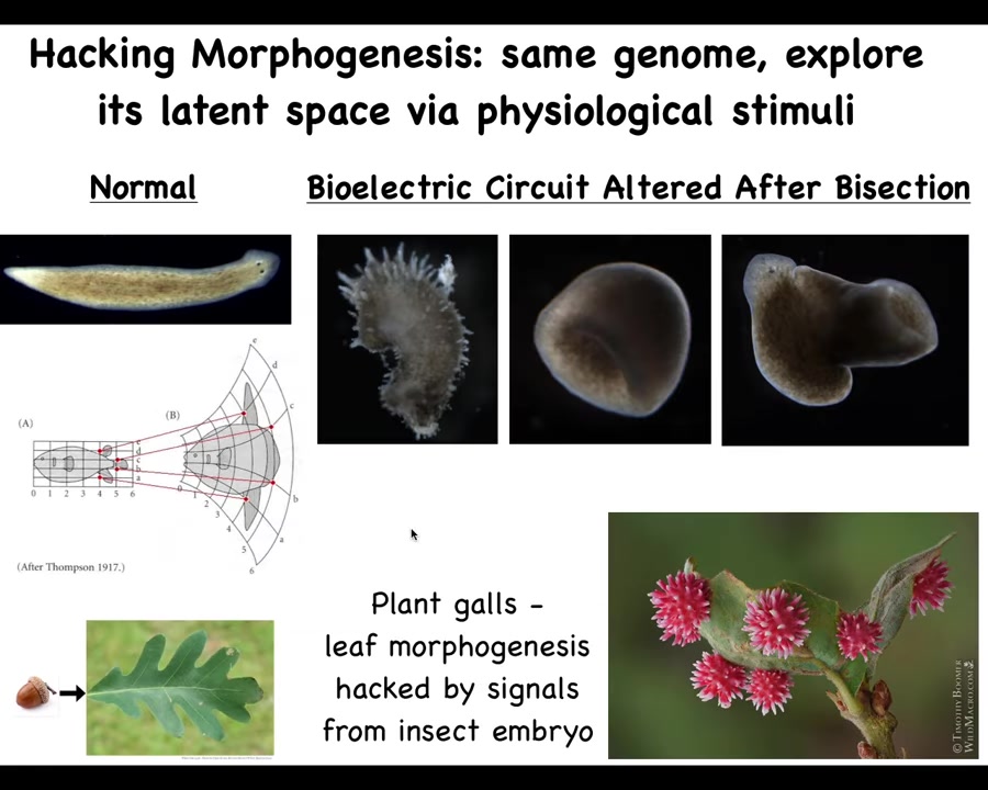 Now, this is a cool example that comes from the plant world. These are acorns and oak leaves, and you might think the oak genome knows how to build these flat green things, but along comes a non-human bioengineer, a wasp that has certain signals that it puts out to hijack the morphogenetic capabilities of the plant leaves and cause them to build something like this. Isn't that amazing? Would you ever think that something like this, that's happened so reliably all over the world, is actually capable? Instead of being this flat green thing, it can actually build these beautiful spiky red structures. And that's because it's been reprogrammed by signals from this non-human bioengineer.