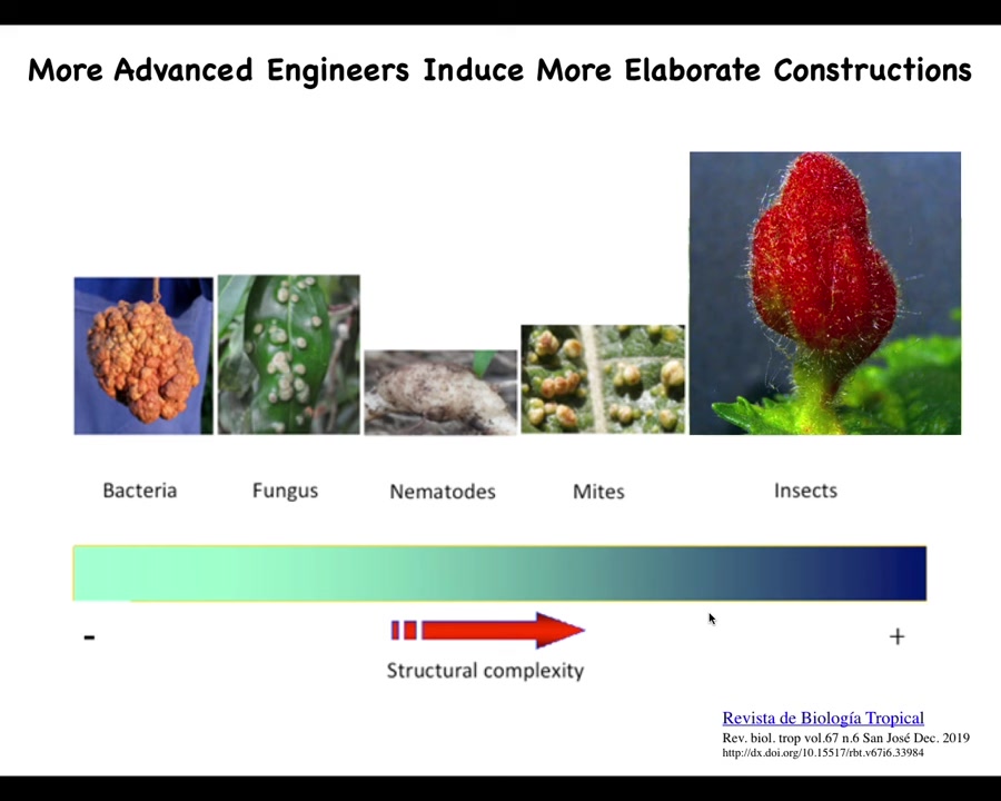 Bacteria and fungi make blobs like this, overgrowth. Nematodes make a shape and mites make little round things. But by the time you get to insects, you can make something like this. This is what they do with the agential material of the plant.
