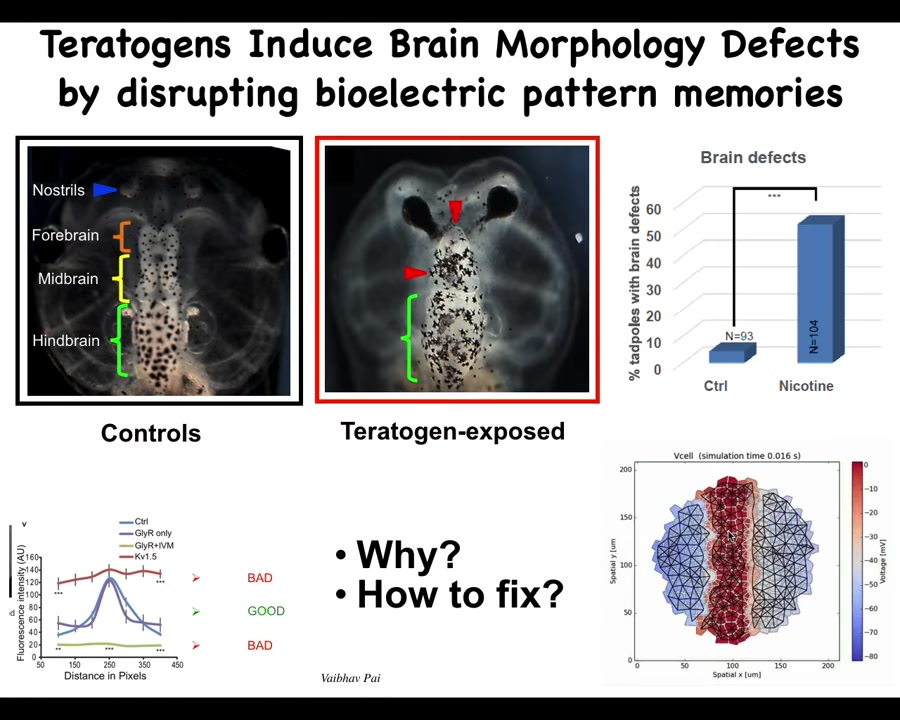 Here's an example of taking that approach to deal with birth defects. Here is a normal tadpole brain. You've got your forebrain, midbrain, and hindbrain. If that embryo is exposed to teratogens, you can see some defects here. There are profound defects here. The question is, how do we repair it? We created a model. This is Alexis Pytak in our center, who created this computational model where the voltage pattern is what tells the brain what size and shape to be. We were able to see that what happens in these teratogen-exposed embryos is that the bioelectric pattern is all wrong.