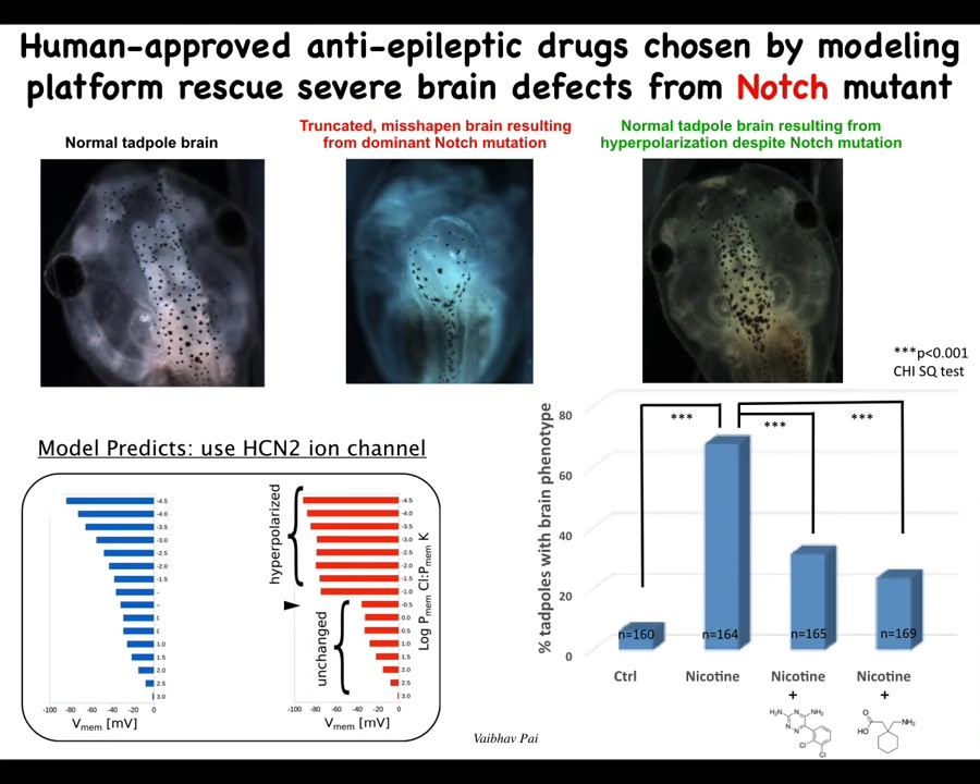 The computational model told us that we could get back to the correct bioelectrical pattern if we upregulated the activity of an HCN2 ion channel, because it would sharpen that bioelectrical pattern. When you do that, you get back to a normal embryo with a normal brain, despite the fact that a dominant Notch mutation is still there. It has normal anatomy. The animal's learning rates are indistinguishable from controls at this point. You rescue the anatomy and the function with this bioelectrical repair method, even though the mutation is there.