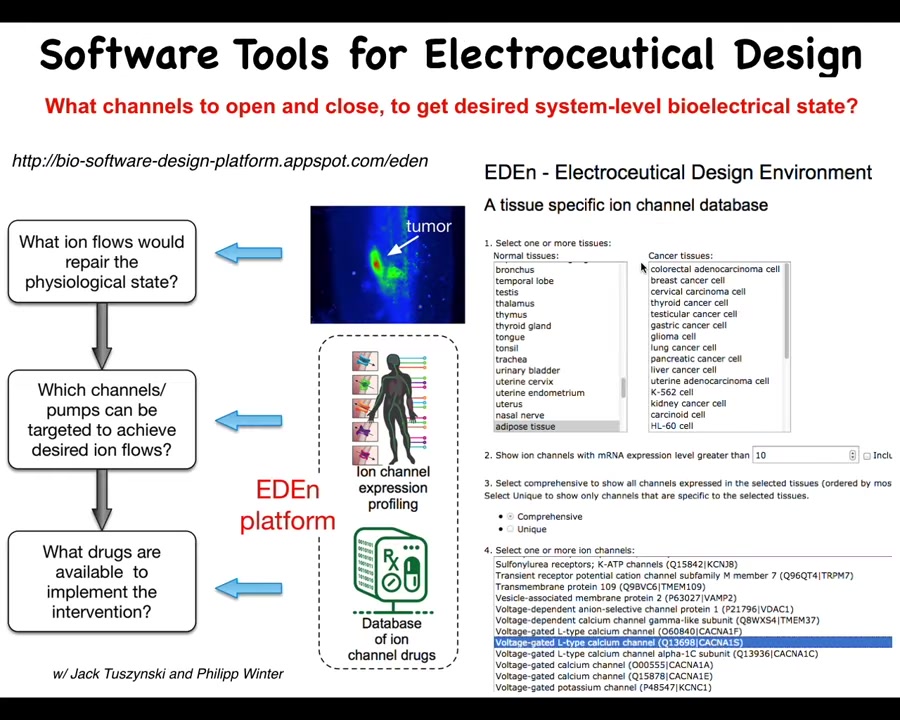 And then there will be a computational component that will ask what channels and pumps could be turned on and off to repair the pattern. Once you know that, you can ask what drugs are available to do that. Something like 20% of all drugs are ion channel drugs. There's this incredible toolkit of our electroceuticals just sitting out there to be applied to all these problems with the appropriate computational models. You can play with an early version of it here. We already have a little bit of this going. I've shown you an example of doing this for birth defects. I've shown you an example of doing this for regeneration.
