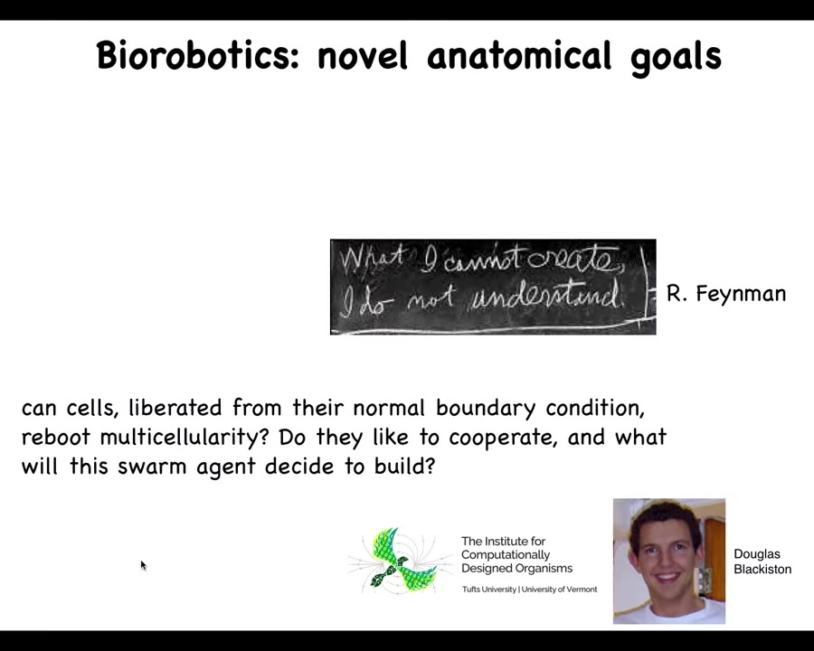 We're going to talk about bio-robotics and specifically this idea of novel anatomical goals. I've shown you systems that pursue evolved anatomical goals, such as having a proper face, the proper number of heads, the proper structure of the brain. But what about novel systems? Where do they get their goals, and what are their goals?