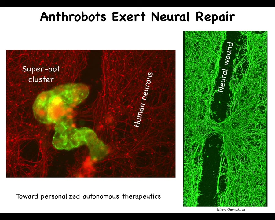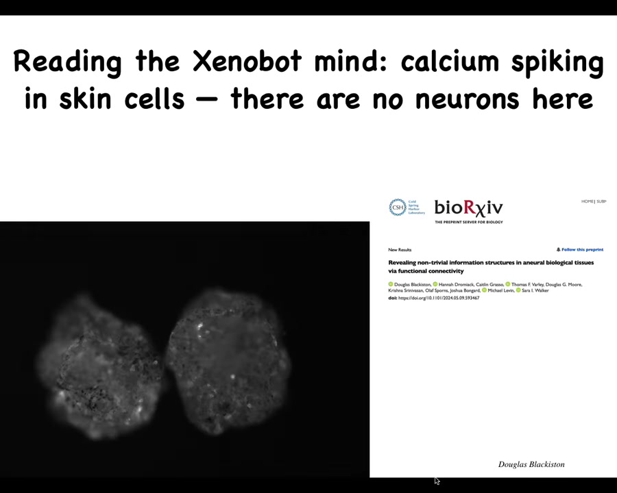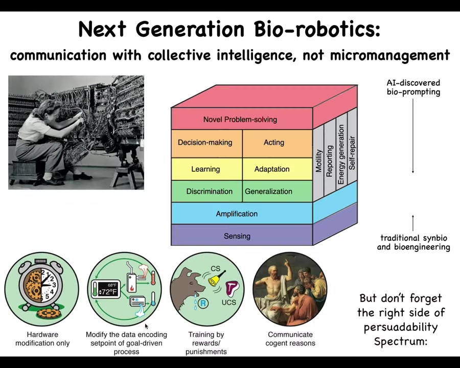 That's for biomedicine. For bioengineering and biorobotics, in many cases you don't want to build from scratch where you have to micromanage all the hardware. The material that we're dealing with already has built-in sensors, amplification machinery, the ability to discriminate signals, to generalize, to learn, to adapt, to make decisions. I showed you many examples. Taking advantage of this is the frontier of bio-robotics; it's not trying to force specific molecular states, but actually communicating and collaborating and reprogramming these existing capabilities. The AI discovered bio-prompting of the material.